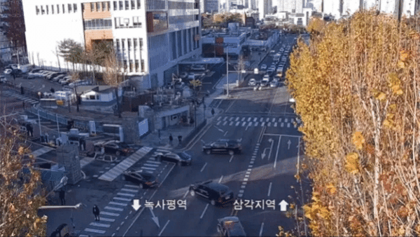 윤석열 전 대통령이 비상계엄을 선포한 지난해 12월3일 오전, 서울 용산구 한남동 대통령 관저를 출발한 ‘가짜출근’ 의심 차량 행렬이 용산 대통령실 정문을 통과하고 있다. 경찰청 도시교통정보센터 폐회로티브이(CCTV) 영상 갈무리