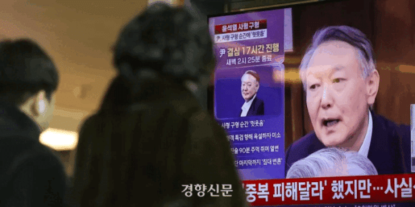 내란 우두머리 혐의로 기소된 윤석열 전 대통령에게 법정 최고형인 사형이 구형된 가운데 14일 서울역 대합실에서 시민들이 관련 뉴스를 시청하고 있다. 성동훈 기자