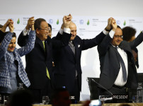 2015년 12월12일(현지시간), 프랑스 파리에서 열린 제21차 유엔기후변화협약 당사국총회(COP21)가 폐막한뒤 크리스티아나 피게레스 전 유엔기후변화협약(UNFCCC) 사무총장, 반기문 전 유엔 사무총장, 로랑 파비우스 프랑스 외무장관 겸 COP21 의장, 프랑수아 올랑드 프랑스 당 . . .